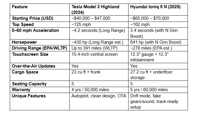 Tesla Model 3 Highland vs Hyundai Ioniq 5 N: Technical Specs Comparison