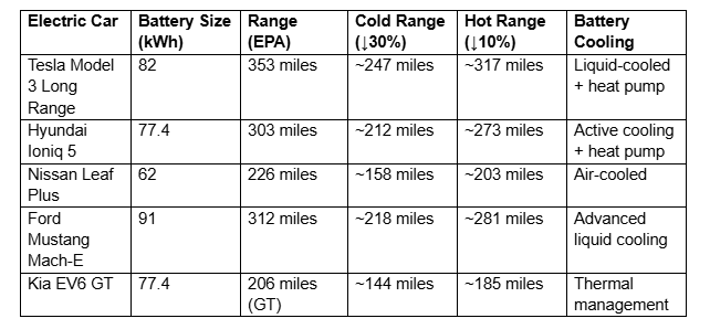 Table: EV Battery Range in Hot, Cold, and Mild Climates