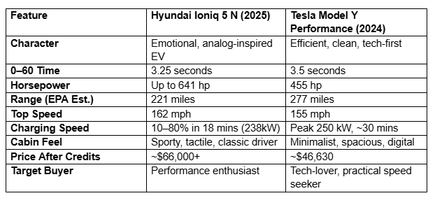 In the fast-moving world of electric vehicles, two names are pulling away from the pack. One is sleek and tech-driven, with Silicon Valley DNA. The other is bold and rebellious, reborn from Korea’s quiet obsession with precision. Meet the Hyundai Ioniq 5 N (2025) and the Tesla Model Y Performance (2024)—two electric beasts that target two very different hearts.
